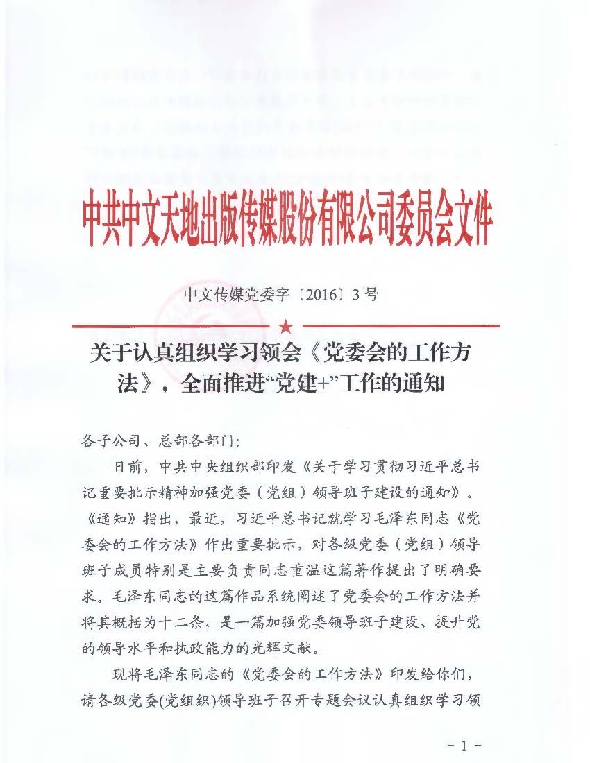 中文传媒党委字〔2016〕3号关于认真组织学习领会《党委会的工作方法》,全面推进“党建+”工作的通知
