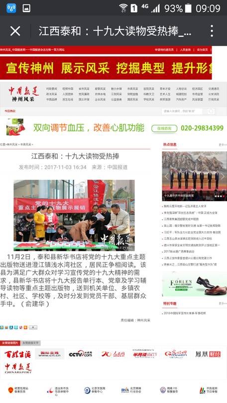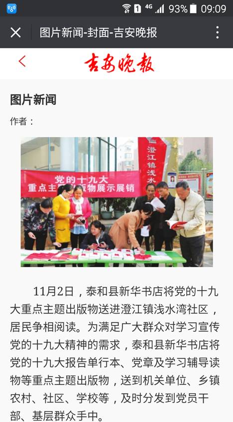 为确保各项准备工作落实到位,县分公司精心布置门市展台,认真挑选相关书籍,做到集中陈列、重点宣传,为广大读者选购十九大文件及学习辅导读物提供优质便利的服务,全方位、多层次地宣传十九大精神。同时,为满足当地党员干部群众对学习宣传党的十九大精神的迫切需求,县分公司与县委宣传部主动联系,组织开展了党的十九大重点主题出版物进社区、下基层活动。此次活动得到了县委、县政府的高度评价,并在《中国报道》、《吉安晚报》予以专题报道,取得了良好的社会效益。