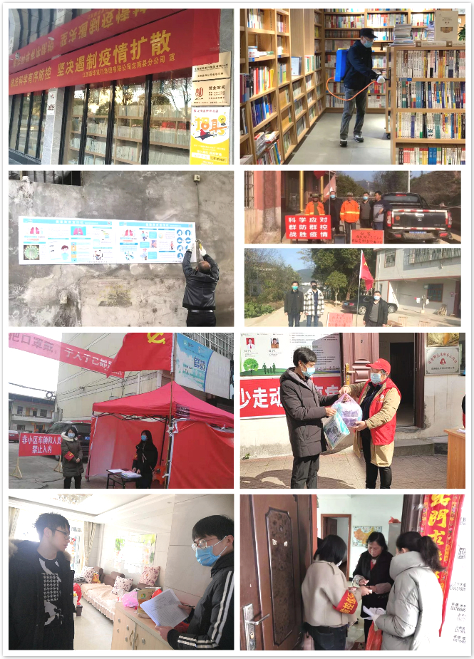 抗“疫”一线,党旗最红。自疫情发生以来,集团下属各分公司党组织发挥基层战斗堡垒作用,团结一心、众志成城、奋力抗“疫”。宜春、抚州、赣州等地区基层分公司充分展现党员先锋模范作用,樟树、南城等分公司党员自发组建疫情防控志愿者服务队伍,积极协助当地政府免费发放疫情防控宣传资料,于都、信丰等分公司领导班子、驻村第一书记带头深入挂点帮扶村镇协助疫情监测、人员摸查,将党旗插在了抗“疫”前线;吉安、上饶、萍乡等地区分公司协助当地疫情防控应急指挥部的部署,开展网格化社区24小时值守防疫工作,将新华红融入鲜红的党旗;南昌、九江、新余、鹰潭、景德镇等地区也积极参与“党建+”基层联防联控工作,留下了江西新华人奋战抗“疫”一线的最美身影。